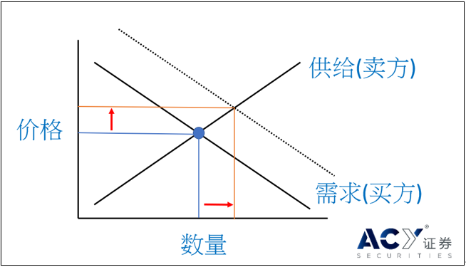 供给线的斜率通常是上升的,因为随着价格上涨,卖方人数也会增加(换言之,价格越高,越多人卖出)。从需求线可看出买方在特定价格上愿意购买的数量。需求线的斜率通常是下降的,因为随着价格下跌,买方人数就会增加。当然市场价格在波动的过程当中,买方与卖方会找到一个买方愿意买进,且卖方愿意卖出的价格,这个价格就是图一当中的圆点(均衡点),也就是供给线与需求线交叉的位置。当然,自由市场的供给予需求线是不断变动的。当投资人的预期改变,买方和卖方可接受的价格也会改变,就如图一的需求线往上移动,表示有越来越多买方愿意以更高价买进。