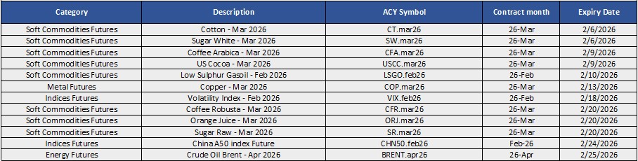 We would like to highlight the upcoming futures CFDs contract expiry schedule for February 2026.