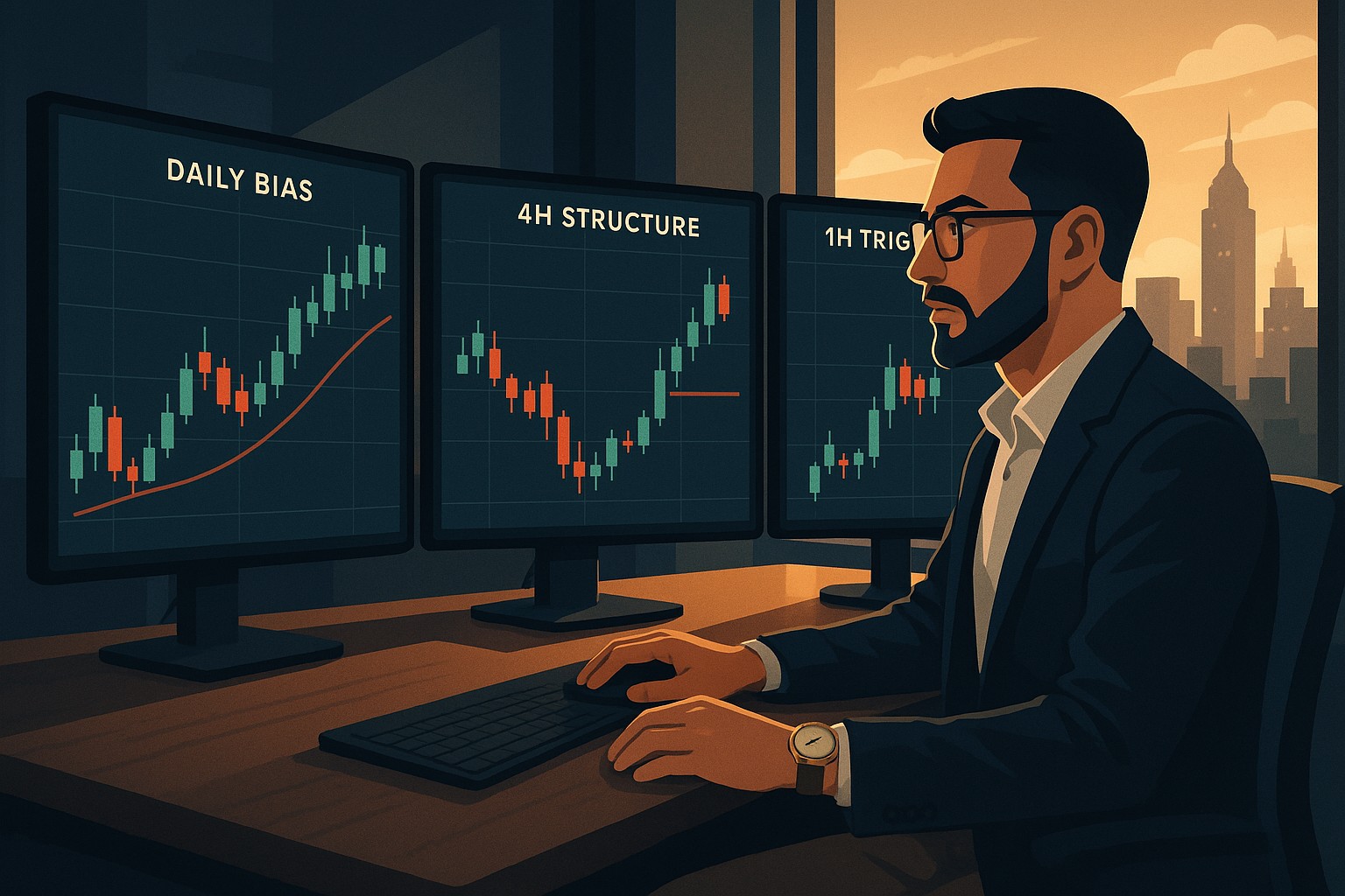 Your daily chart shows the terrain, your 4-hour chart reveals the path, and your 1-hour chart gives the entry point. The workflow is simple: define bias on the Daily, map the pullback or continuation structure on 4H, then refine triggers on 1H.