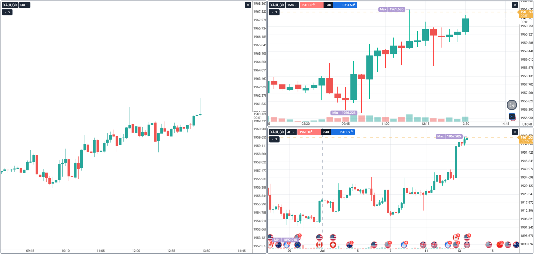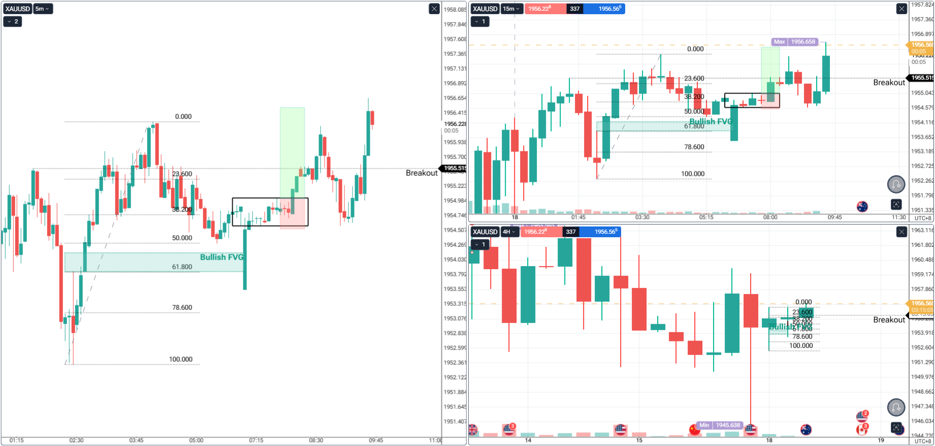 • On the 4H chart (bottom right), price recently rejected from a key zone near 1950. With this rejection, we are looking for strength to breakout since the rejection signaled a fakeout.