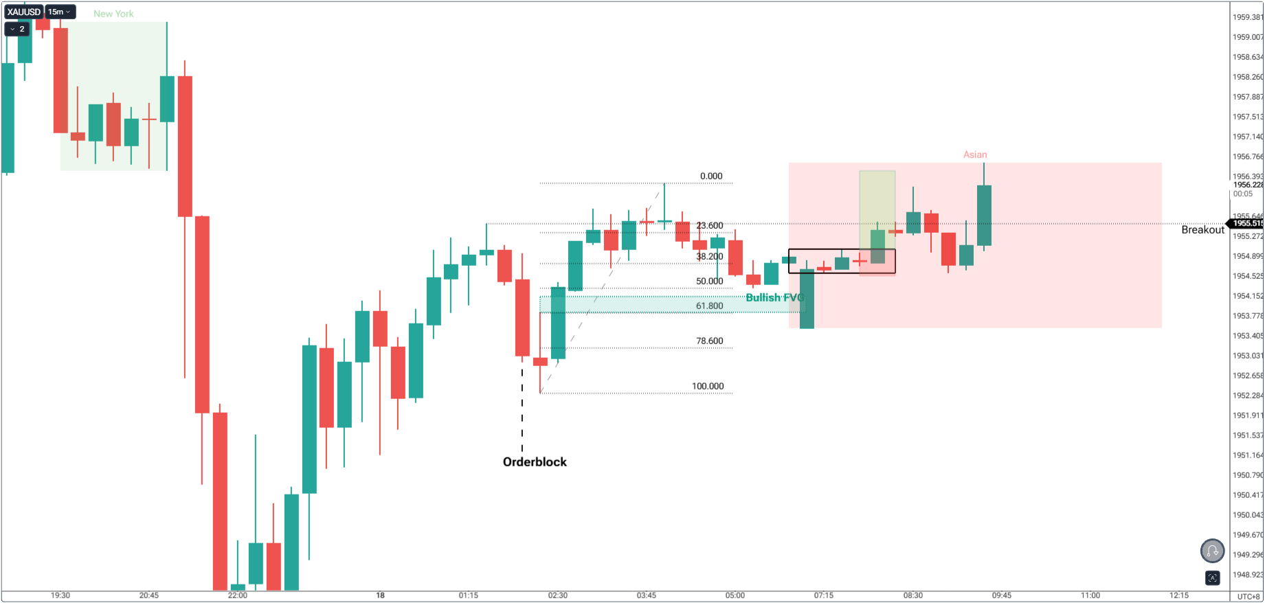 • The 15M chart (top right) shows how price retraced into that M15 FVG level, around the 61.8-78.6% retracement level — perfect confluence level. Adding to the confluence is the orderblock.
