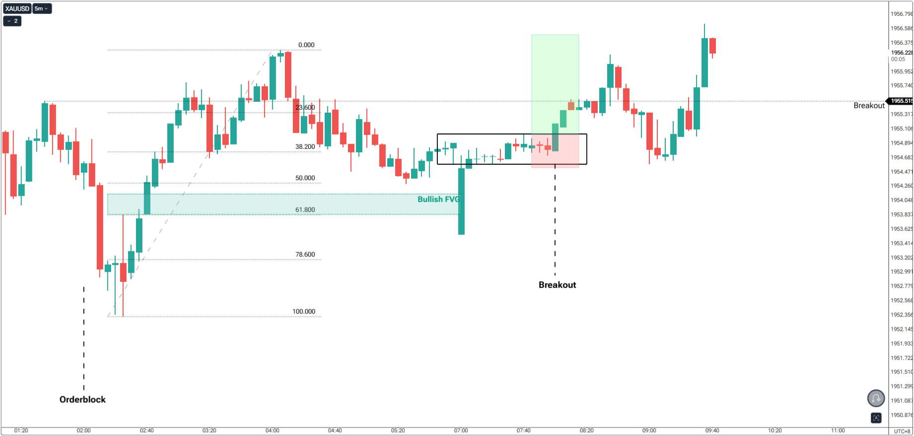 • After the sweep, price forms a small consolidation (the black box), then breaks structure upward (marked as “Breakout”).