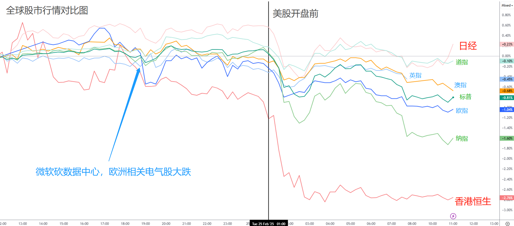 微软或许是导致市场下跌的关键因素。昨日有报告称,微软近期取消了多个数据中心运营商的租赁协议,涉及数万兆瓦的电力需求,并砍掉了两个数据中心项目。作为AI资本支出最激进的企业之一,微软的这一举措引发市场联想——它是否已经意识到供应过剩的问题?仅仅是这个可能性,便足以让热钱迅速撤离。美国相关科技股以及欧洲的电气股因此表现最差。