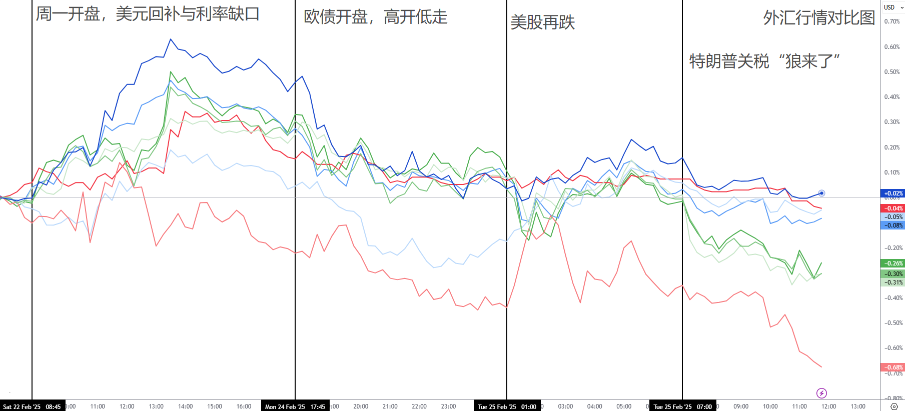 美国科技股第二天开盘大跌,等不到英伟达财报,回调就已经开始了。特朗普重申3月4号按计划加征加拿大与墨西哥关税,美元震荡上涨,澳元持续贬值。