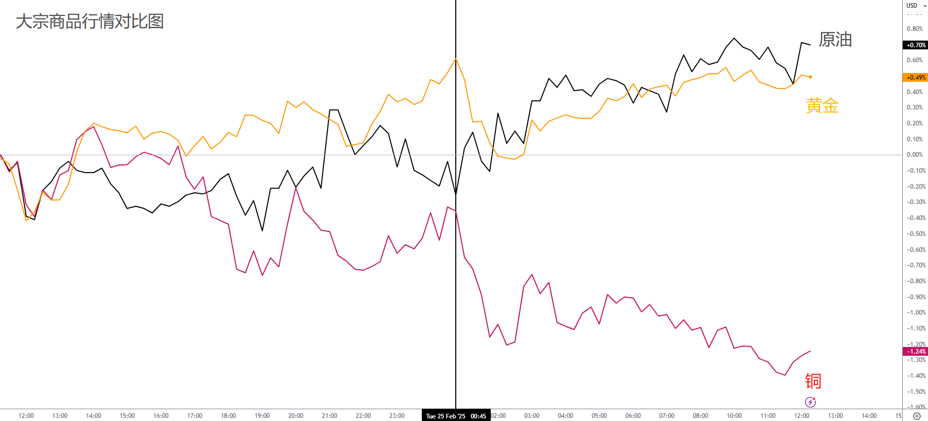 大宗商品的背离行情还在继续,美股大跌后,铜价持续贬值,但黄金却在短暂下跌后,持续回补跌幅。而原油的价格在抵达70关键大关后,震荡上涨。均为看到明显的消息面动能。