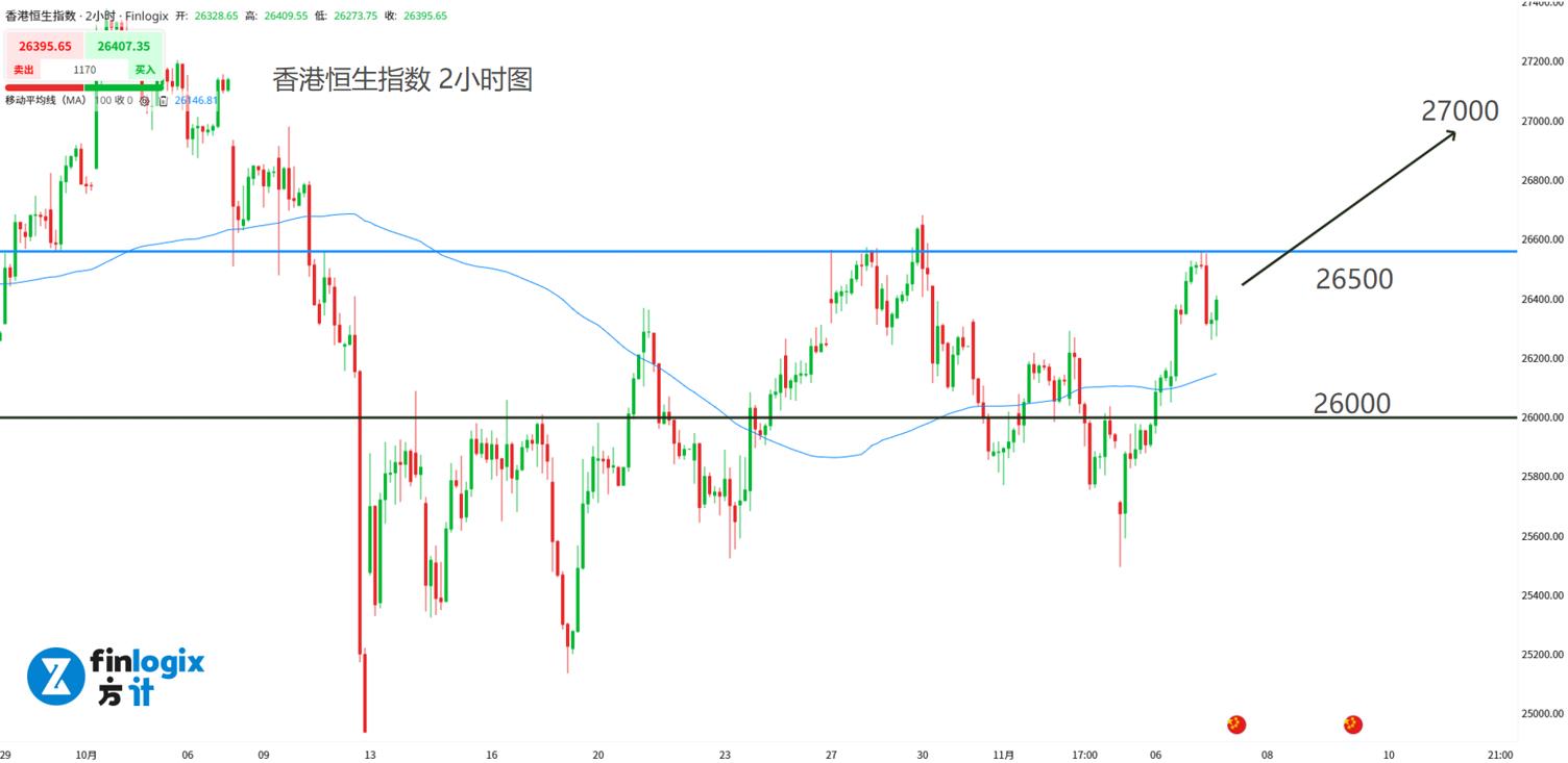 技术面:100均线出微微向上,短线多头动能强劲。但还是要看开盘方向,如果开盘半小时内保持上涨,那么日内便关注线上突破的跟随机会。但如果开盘后边转跌,那么指数可能会再度回踩26000大关。消息面关注中国出口数据表现。