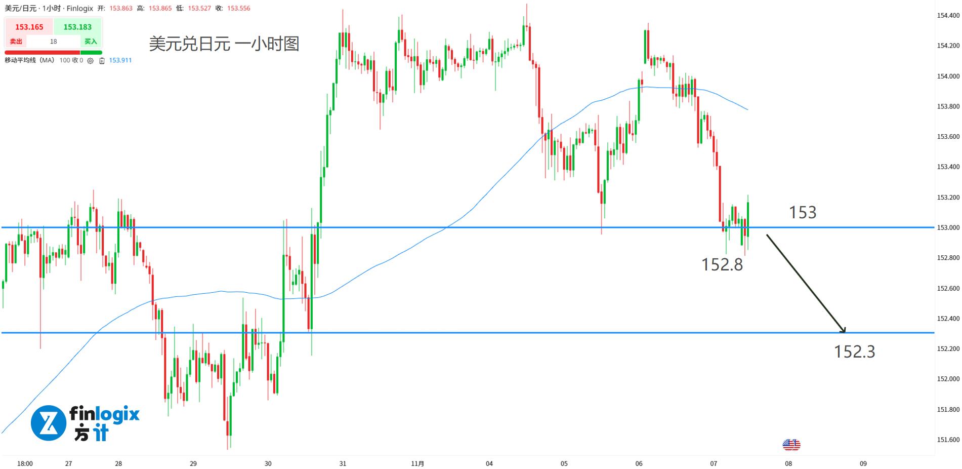 日内交易策略:(趋势跟随)欧美盘跌破153或152.8跟随看空