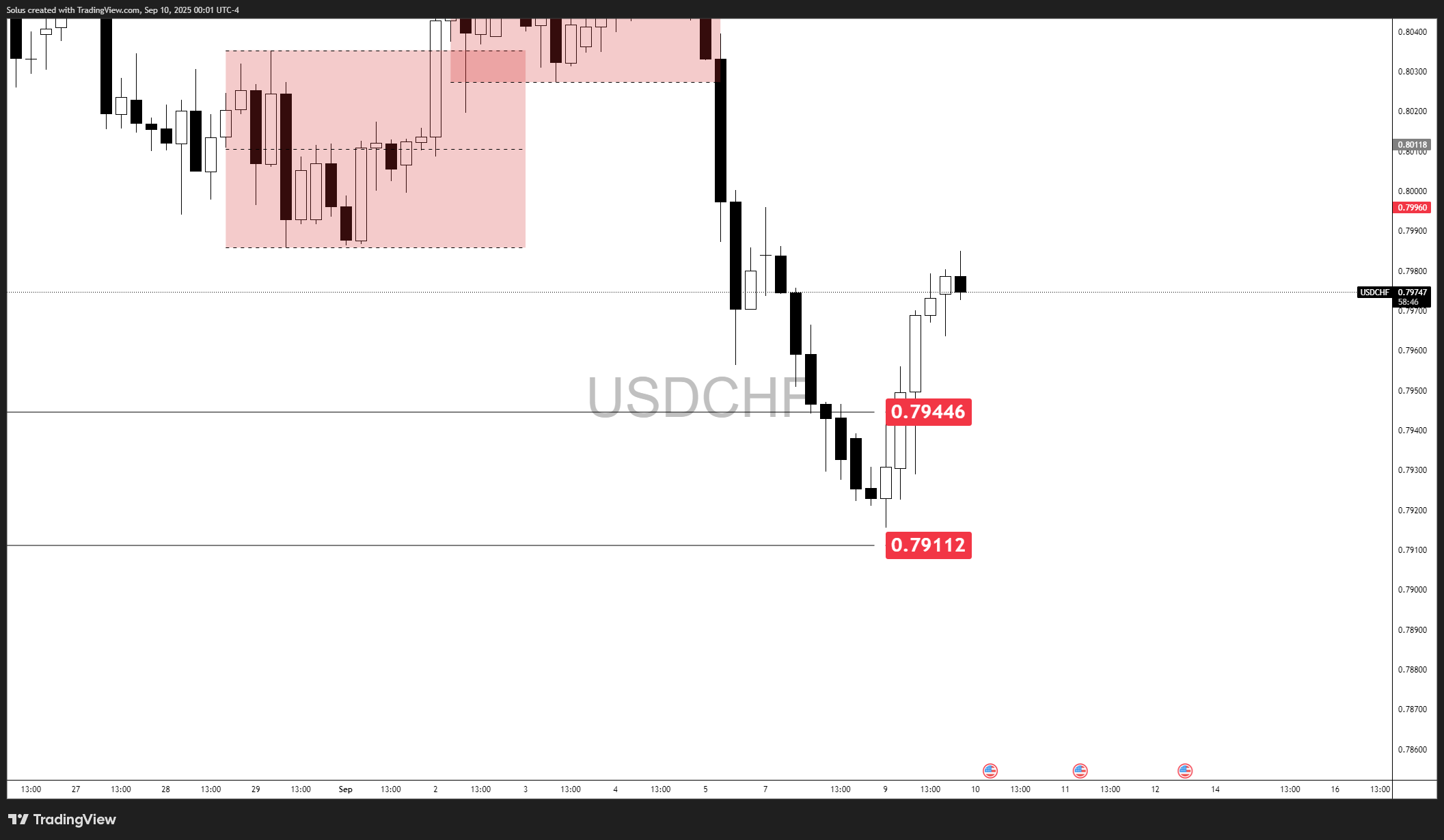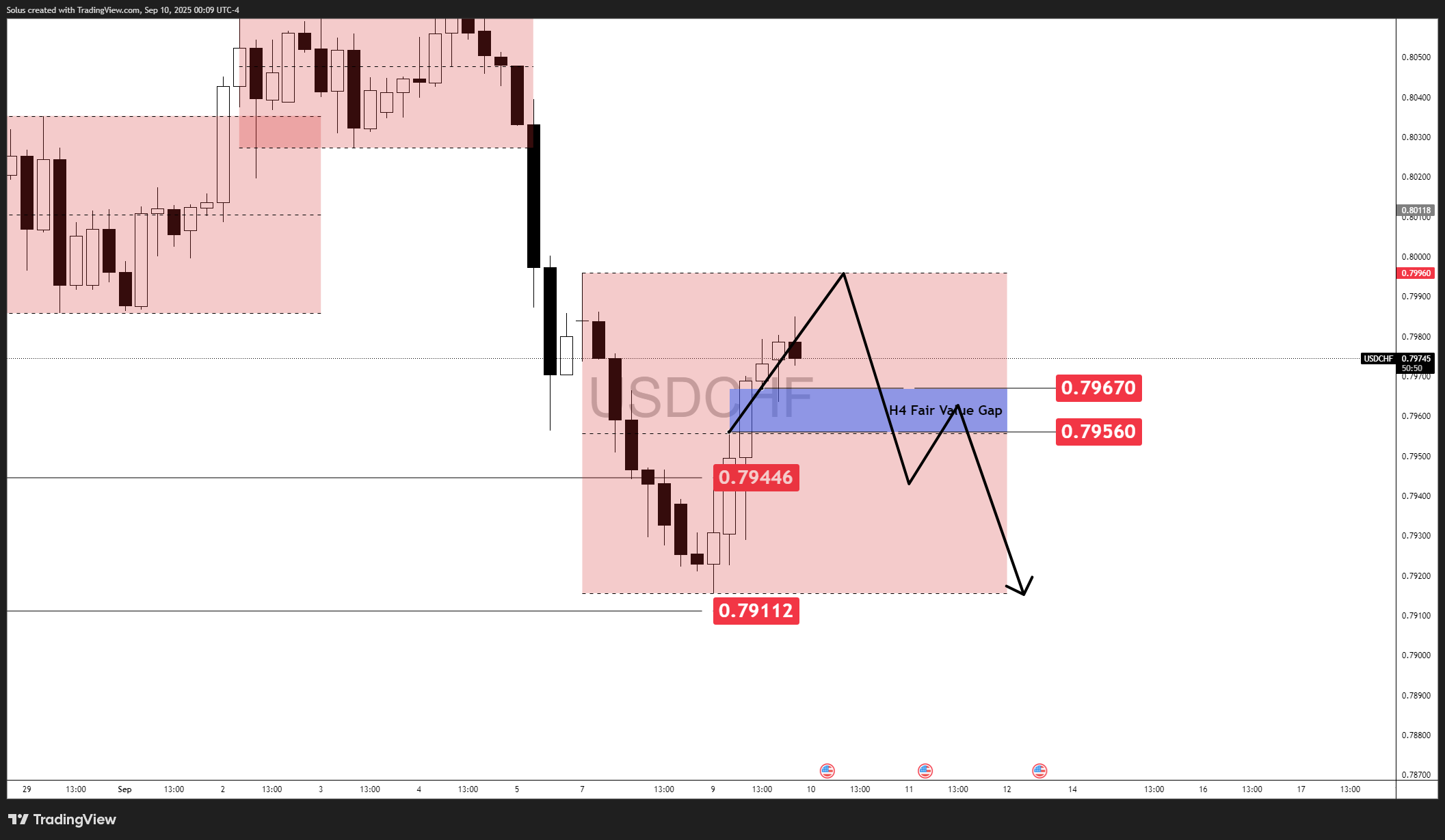 • USD/CHF bearish bias intact below 0.7967 FVG; bulls need reclaim above 0.8000, bears target 0.7911 liquidity.
