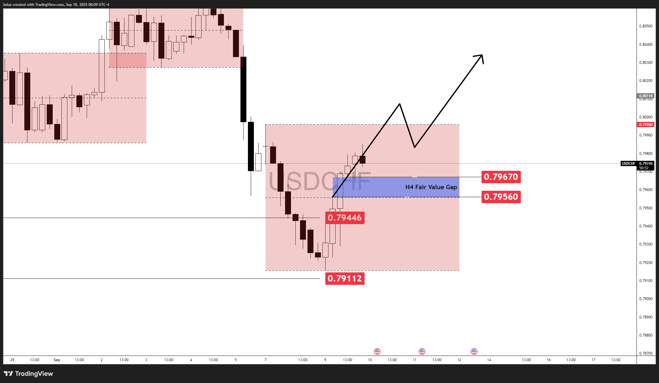 • Trigger: A sustained reclaim and close above the 0.7956–0.7967 H4 FVG zone.