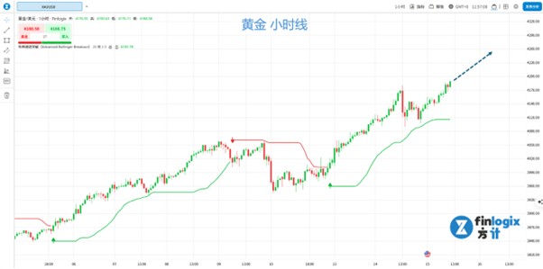 技术面:金价持续创高,没有理由对高点设限,这种行情就是动能交易的最佳代表,可考虑使用Finlogix内建的独家指标”布林通道突破”跳上车,下方的追踪线(也是短线多方的防守线)会告诉你短线行情何时可能结束。