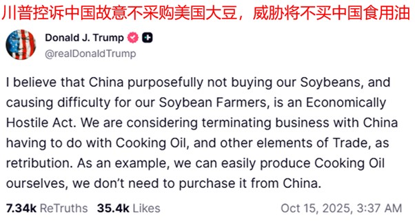 中美贸易争端骤然加剧成为市场焦点。美国总统川普凌晨于Truth Social强硬发文,威胁将“考虑全面终止与中国在食用油及相关产品领域的贸易”,作为回应中国暂停采购美豆的“经济敌对行为”,这一强硬信号加剧投资者对美中摩擦升级的担忧,市场避险情绪迅速升温。黄金突破历史高位,新兴市场股市和风险资产全面承压,中国A股与港股集体回调,原油价格再创五个月新低。