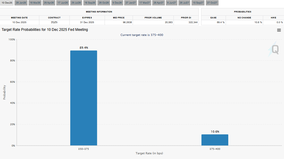 • US Dollar slips as Fed rate-cut bets return, with markets now pricing an 89.4% probability of a December cut from 375–400 bps to 350–375 bps.