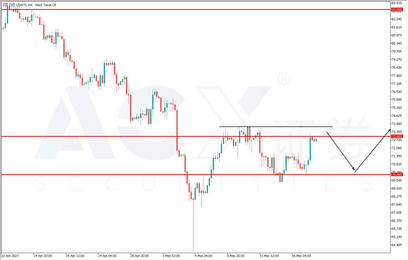 从WTI原油四小时图来看,受到本周恐慌消退的影响,油价触底反弹,回到73的箱体上沿位置。考虑到区域银行与债务上限没有得到根本上的解决,油价上方随时会出现强空头压力。日内的交易策略应该以左侧逢高做空为主,关注73-74供给区的阻力效果。不过一旦价格上穿74前高点,便需要及时止损。长线投资者则可以关注油价回调至70大关的逢低入场机会。