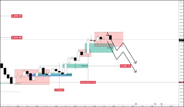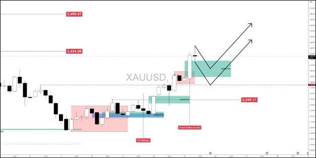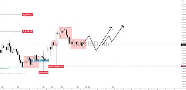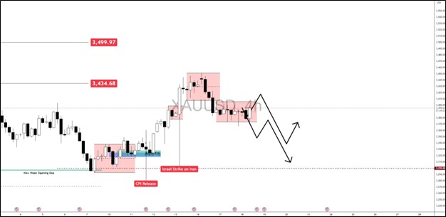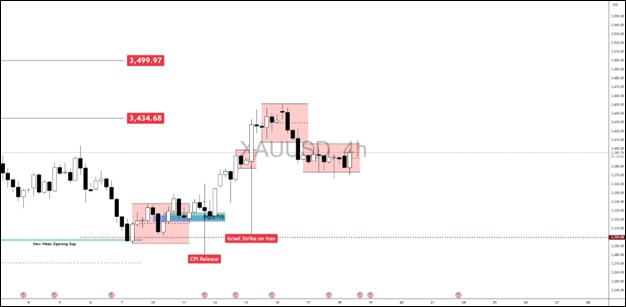 Gold is currently trading at a tight range after pulling back from $3,450 level. Previously, created a new impulse leg to the upside fueled by the soft-CPI release and Israel-Iran renewed conflict.