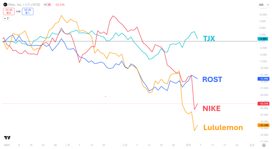服饰业的主要生产地—东南亚,面临巨大的对等关税压力(越南46%、印尼32%),厂商的成本与消费者需求都将面临重大负面打击,Nike、Lululemon股价重挫,反而替『折扣服饰业』带来机会,甚至在08年大衰退期间,折扣服饰业的同店销售成长仍优于其他服饰同业,具有更好的抵御逆风效果。