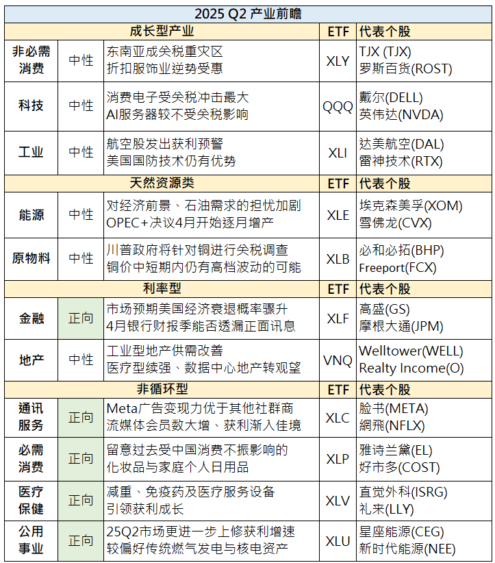 股价通常领先基本面一到两季提前反应,因此展望美股各产业板块在2025年第二季的基本面表现,可以协助投资人在4月布局相关个股或ETF。