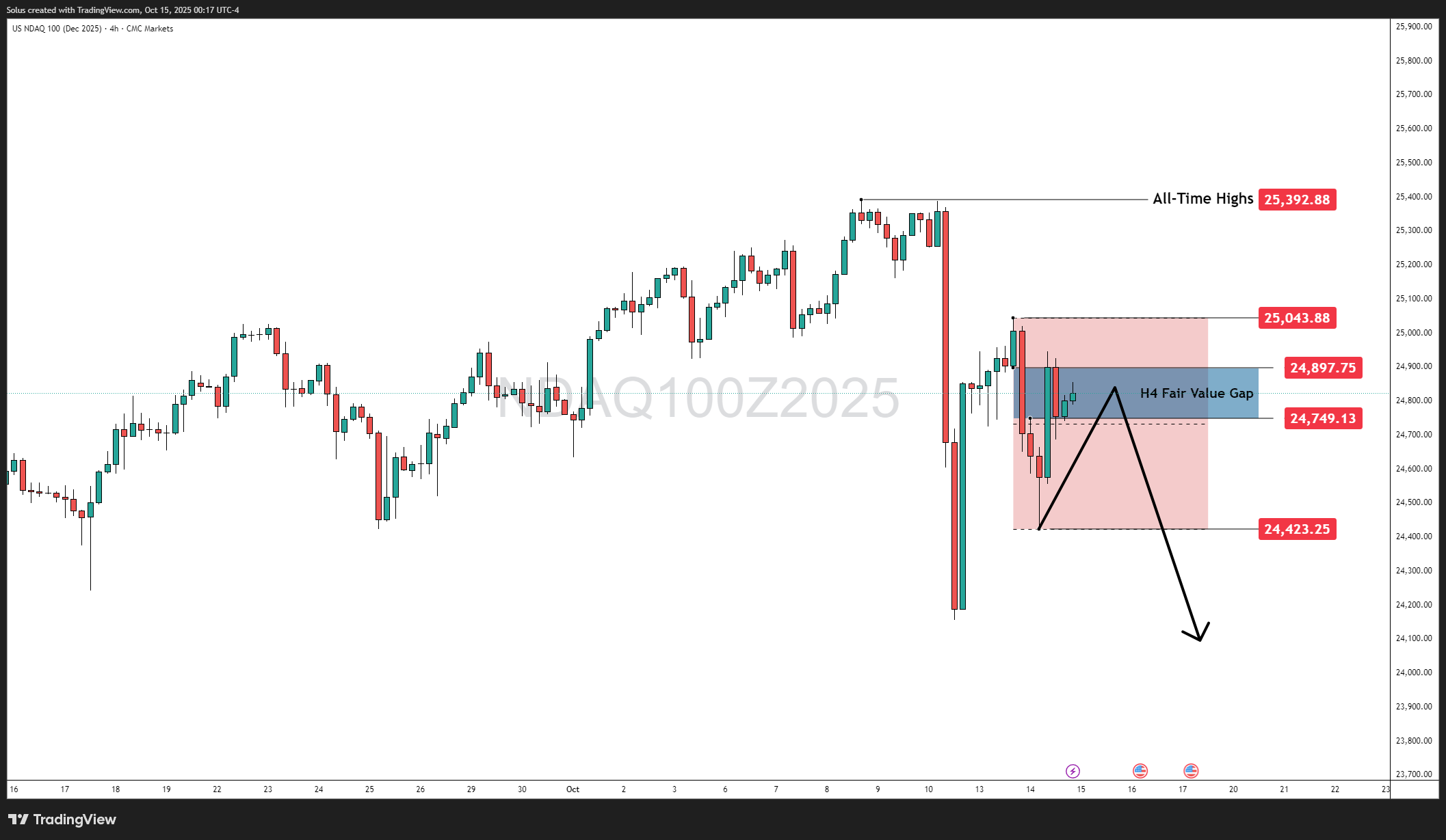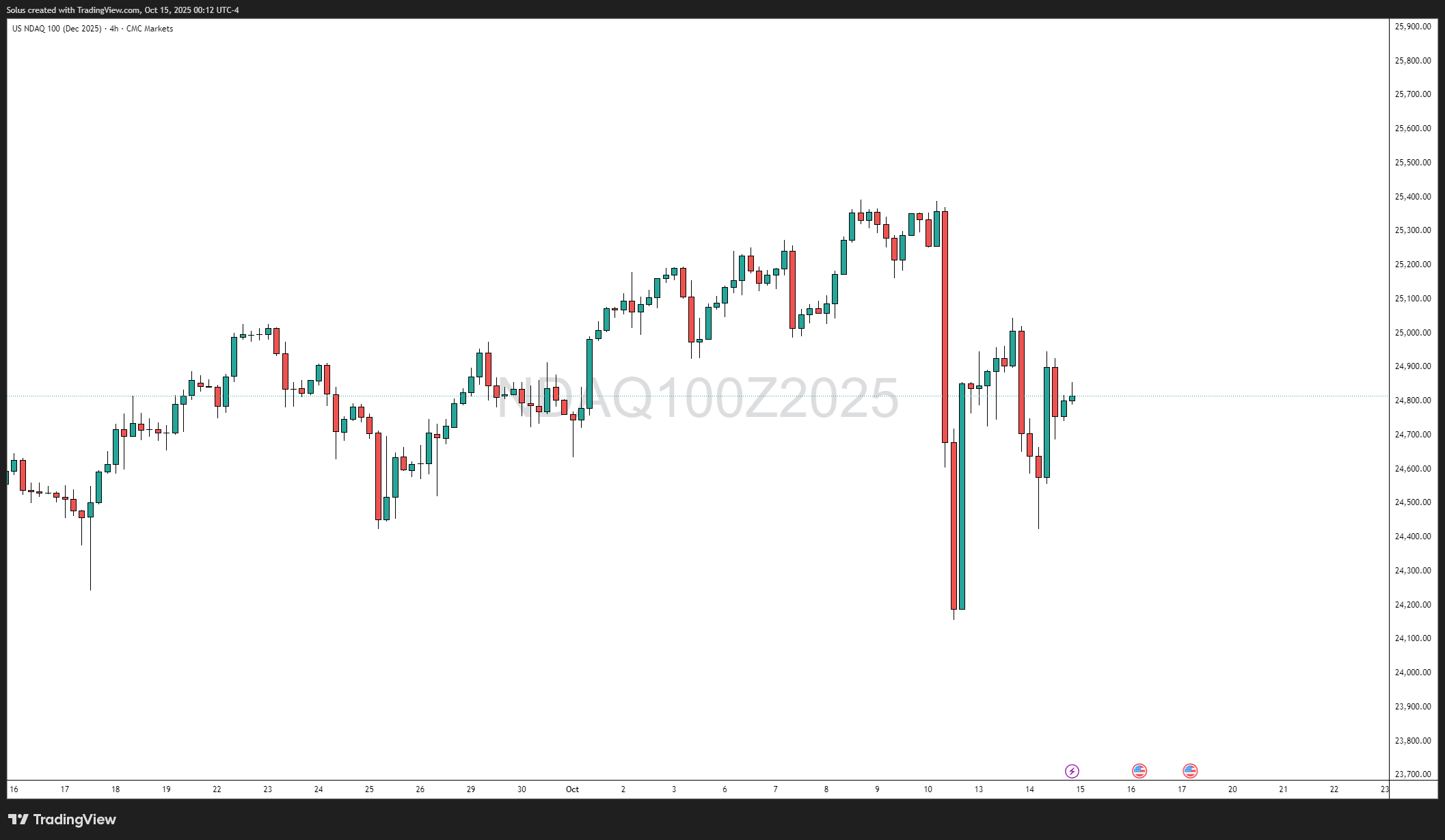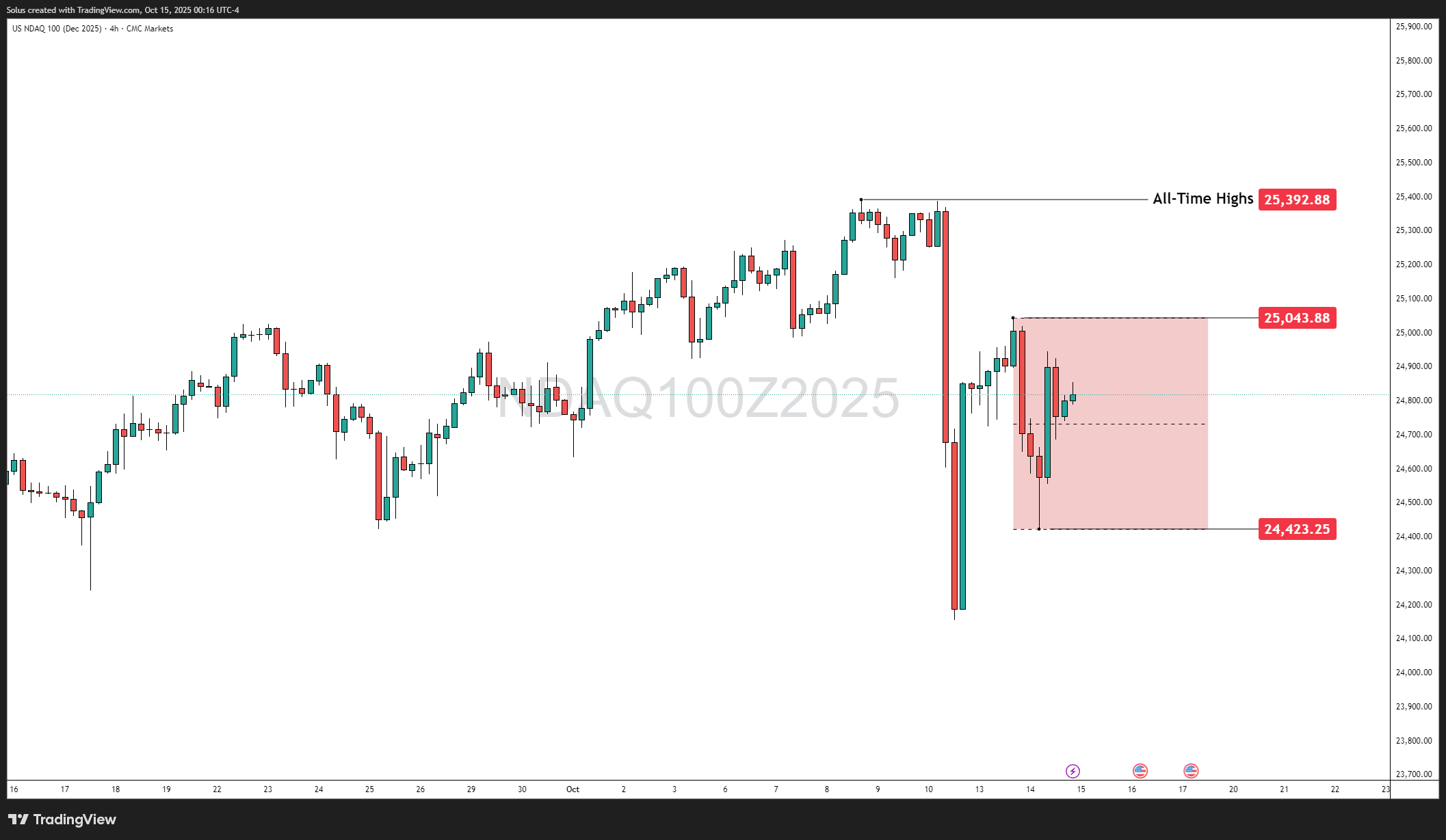 The Nasdaq 100 (Dec 2025 Futures) has been oscillating between relief rallies and corrective pullbacks after last week’s tariff-driven panic. The latest 4-hour structure highlights a tight range between 24,423 and 25,043, carved by volatility shocks from both political and economic catalysts.