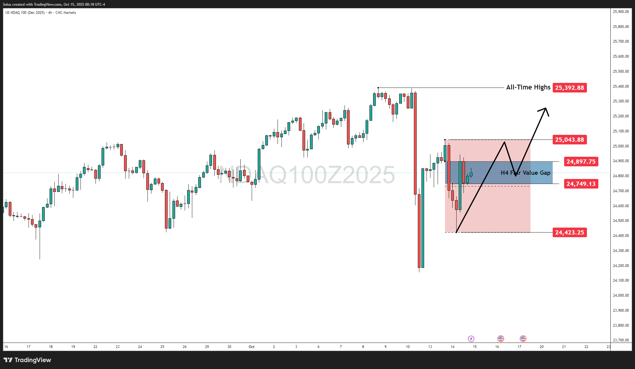 Price compression within the H4 Fair Value Gap signals that volatility is loading, not fading. The next clean break above 25,043 or below 24,423 could set the tone for the rest of the month.