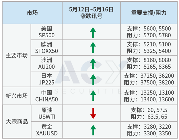 美中上周末在瑞士举行的贸易谈判,双方都表示取得重大进展,更进一步推动周一全球股市跳空大涨,乐观情绪能否延续,则须持续留意美中双方是否公布具体内容。中国上周降准降息,并加大力度支持科创产业,科技为主的港股表现或将优于陆股;欧洲、日本与美国的谈判则面临较多阻碍,因此本周全球股指交易方式以逢低有支撑时偏多