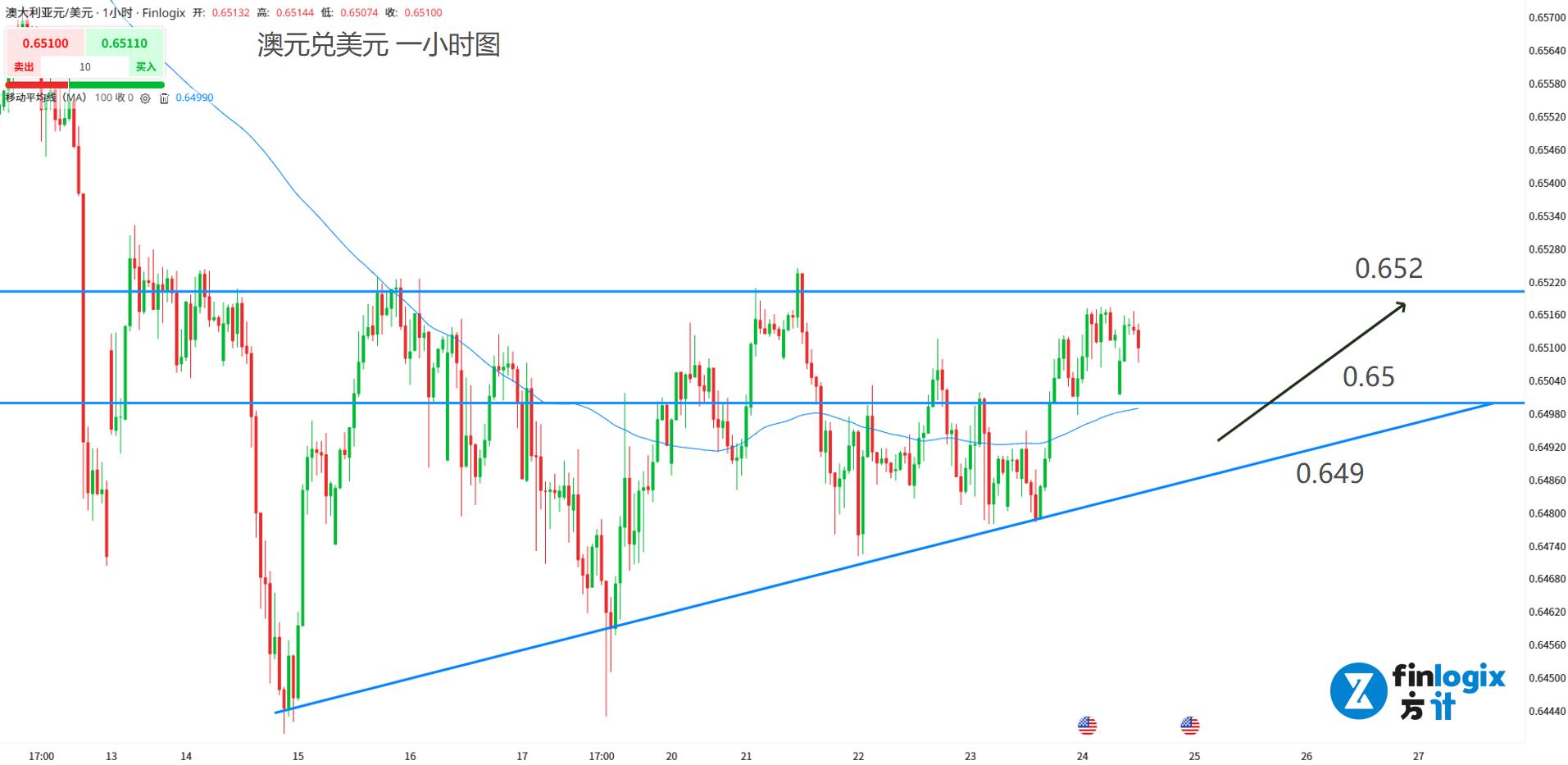 技术面:100均线向上,趋势线提供支撑,澳美汇率在前低点存在支撑力量,交易策略以低位看涨为主。但上方0.652是支阻互转水平线,突破的动能可能不足,因此可以在该位置止盈离场。