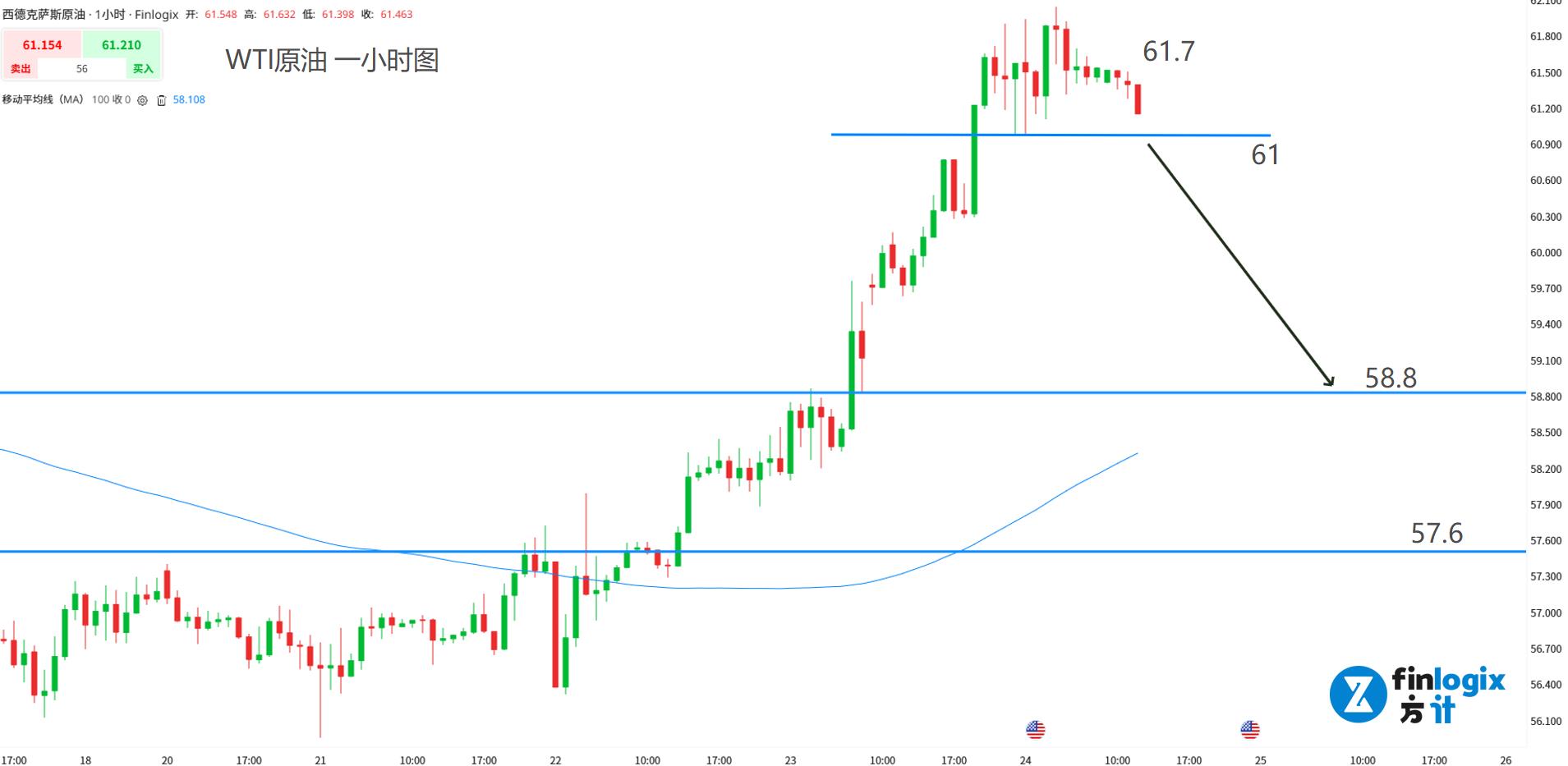 技术面: 100均线向上,空单设好止损。关注油价跌破61颈线的空头信号,下方的支撑主要看斐波那契回调线60整数位大关,以及支阻互转水平线58.8附近。