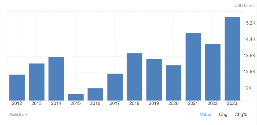 GDP growth is widely regarded as a key indicator of an economy’s strength and stability. A growing GDP typically suggests an expanding economy, attracting forex interest and, in turn, strengthening the Euro. For example, from 2015 to 2023, the Eurozone’s GDP increased from $12.2 trillion to $15.2 trillion, as seen in the chart. This expansion reflects a period of economic recovery and growth following global disruptions.