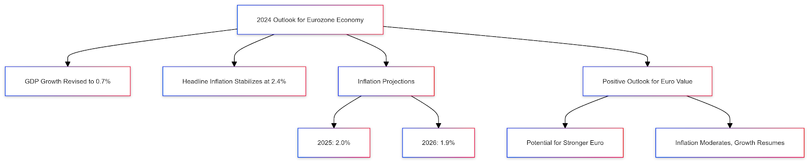 • 2024 Outlook: For 2024, the Eurozone's GDP growth has been revised upward to 0.7%, signalling a more positive outlook for the region’s economy. Additionally, headline inflation, as measured by the Harmonised Index of Consumer Prices (HICP), is forecast to stabilise at 2.4% for 2024, with slight downward revisions to 2.0% in 2025 and 1.9% in 2026. This forecast provides a more optimistic outlook for the Euro, suggesting the potential for a stronger currency as inflation moderates and economic growth resumes.