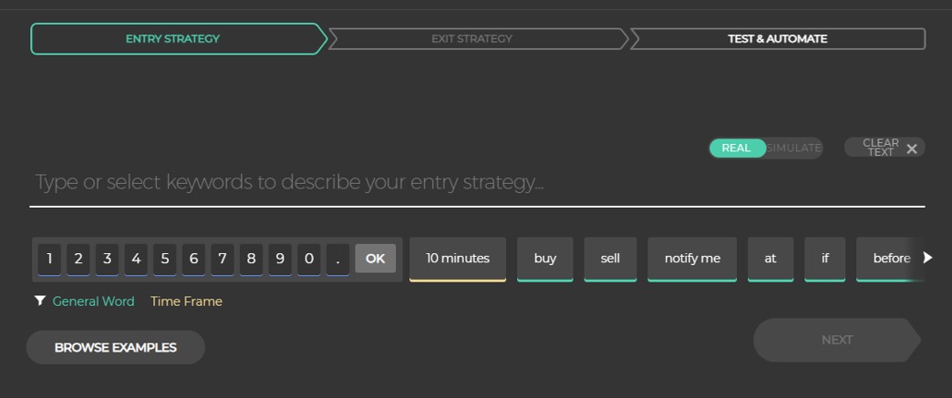 此处可让使用者编写进场规则,用户可先试着天马行空的撰写,把脑中的写法或交易经验直接转成英文,不用考虑文法,就算写错,Capitalise.ai也会用红字提醒。