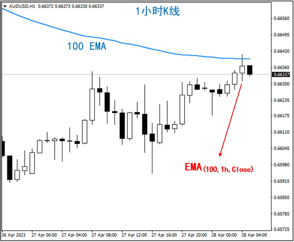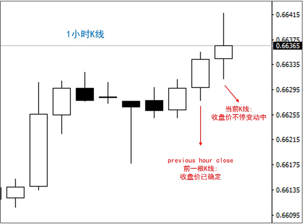 首先,当前K线的价格能否确实站上100 EMA,只有等这根K线跑完的时后才有办法知道,因此我们必须使用previous hour close这样的逻辑得到一个已经结束的K线的收盘价,可参考下图理解这样的关系。