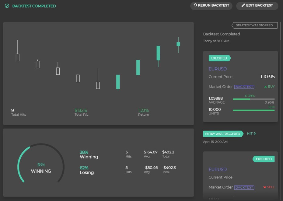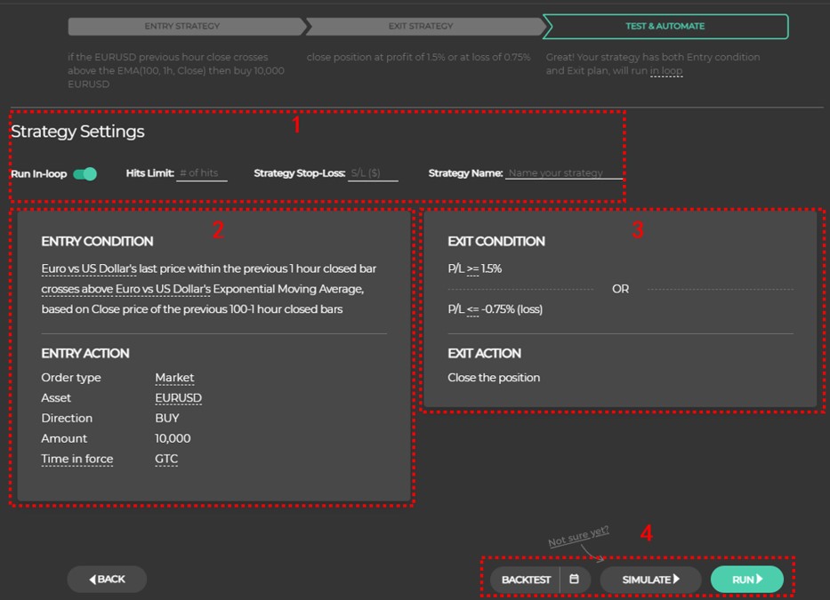 回溯测试是让交易者用过去的资料验证当前策略跑出来的效果;实盘模拟是让交易者以未来的资料直接测试策略效果好不好,但不会实际把交易送出,而是在Capitalise.ai内部服务器计算运行效果;实盘交易也是让交易者以未来的资料直接测试策略效果好不好,并实际把讯号送到MT4服务器直接进行买卖。