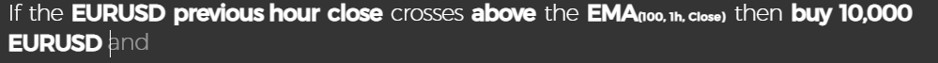 If the EURUSD previous hour close crosses above the EMA(100,1h,Close) then buy 10,000 EURUSD