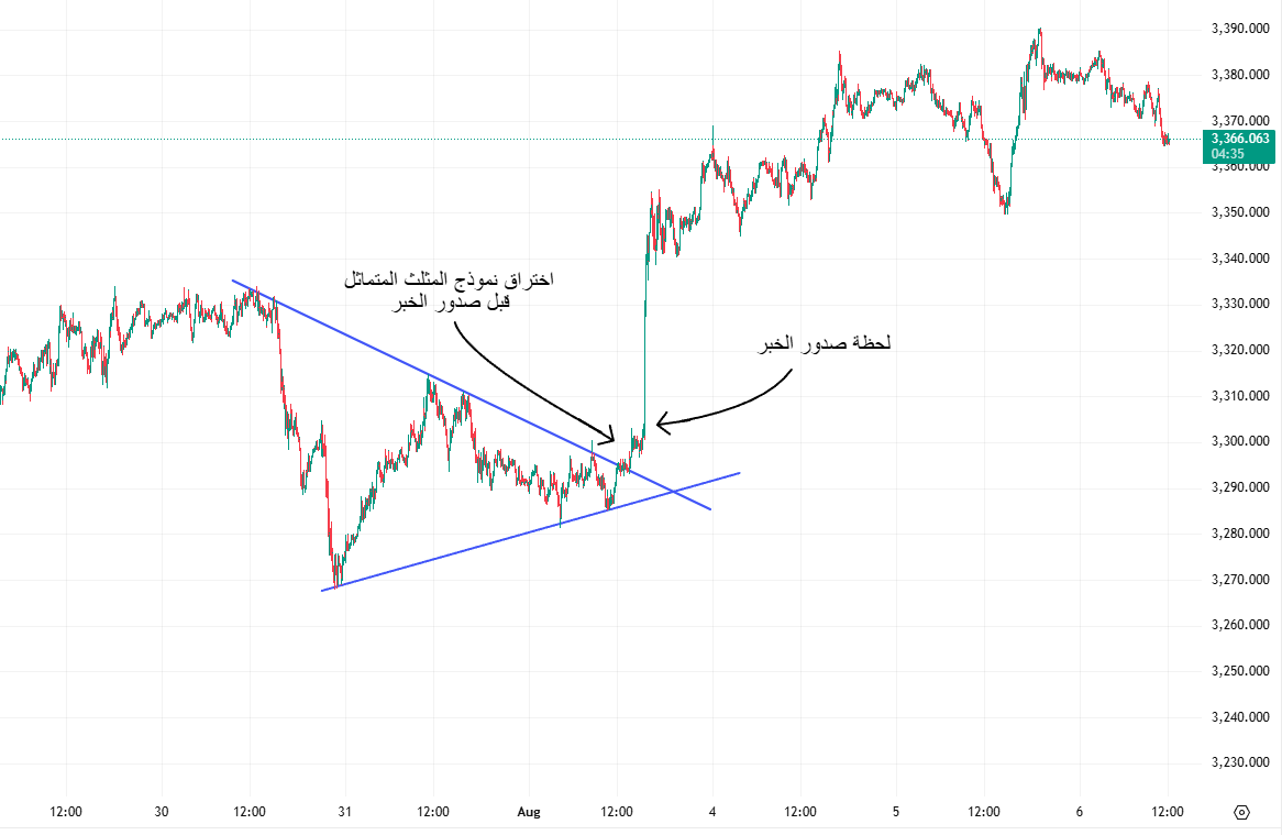 في بعض الحالات قد تظهر اشارات فنية على الرسم البياني للبيع او الشراء قبل صدور الخبر و في هذه الحالة يمكن الدخول في صفقات بحذر مع مراعاة ادارة رأس المال و ايقاف الخسارة المناسب.