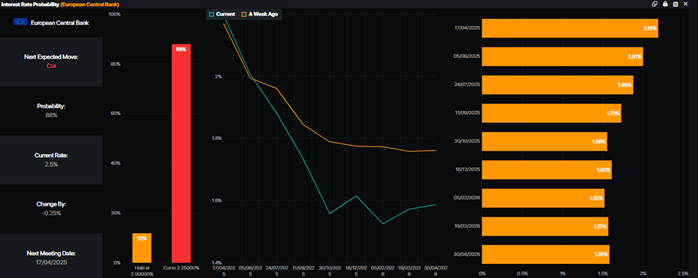 Markets are heading into the European Central Bank’s April meeting with a clear expectation: another 25bp rate cut. After weeks of mostly dovish data and easing inflationary pressure, this move looks all but locked in. The disinflation story is gaining traction and barring any geopolitical blow-up or sharp macro reversal, the ECB seems poised to stay the course on its easing cycle.