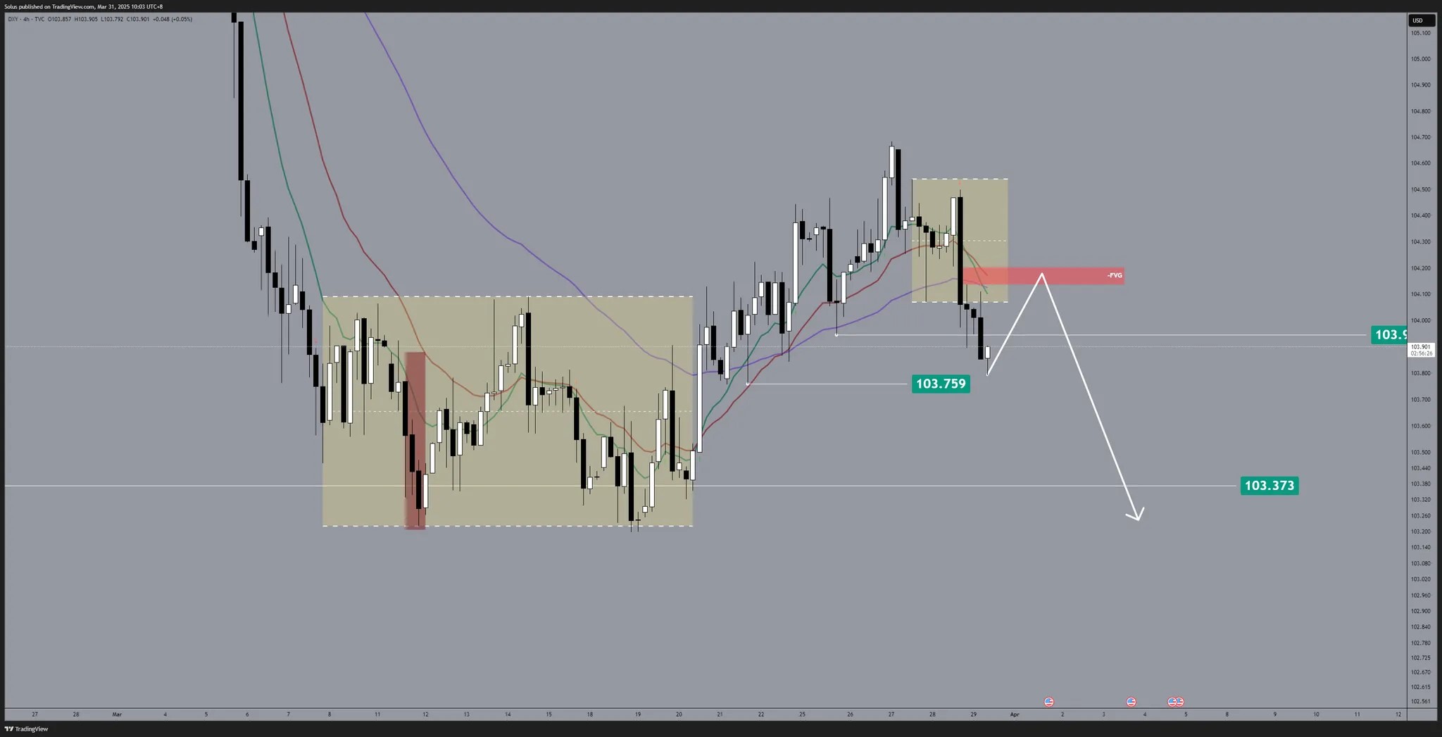 Potential breakdown scenario for Dollar once price reacts bearishly at the 104.137 - 104.203 level.
