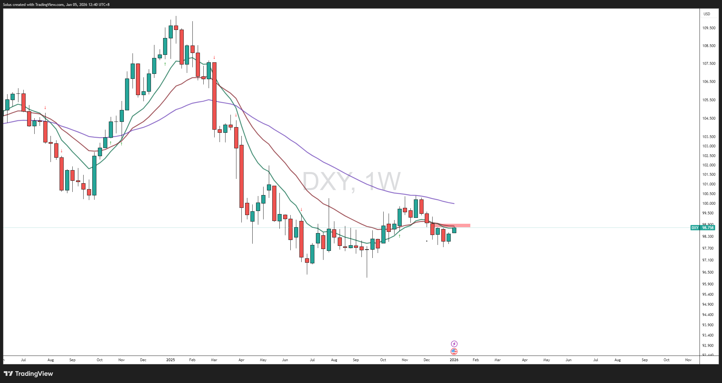 Daily and weekly charts point to initial downside with key support near 96–97 DXY, while resistance around 100 will define short‑term bullish invalidation.