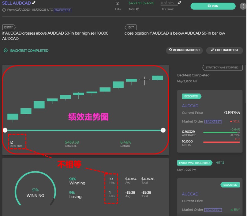图一代表的是我们将一个策略进行历史回测之后的画面,眼尖的朋友或许会发现到中间的绩效走势图的交易笔数是12笔,而在回测数据的统计上却是11笔(10+1),这可不是Capitalise.ai工具有臭虫(bug),其中的差异在于最新一笔的交易尚未平仓,而绩效走势图会把已平仓及尚未平仓的数据都包含进去,但回测的统计数据只会包含已经平仓的数据。