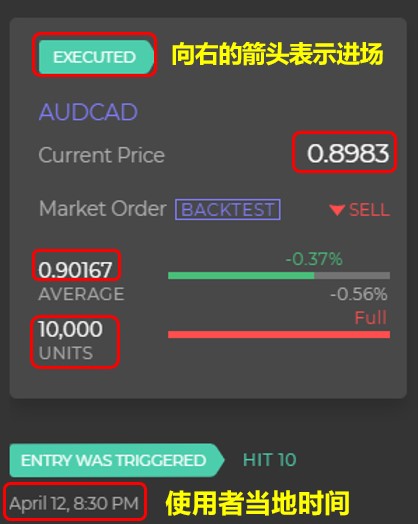 我们以图六为例,去找到第10笔交易后可看到如下画面(备注:右边的交易明细是逆序排列的,也就是越上方的交易是越新的交易),向右的箭头表示进场,这里的时间点为晚上8点半,要记得Capitalise.ai显示的是使用者的当地时间,以笔者为例就是台北时间。接着各位可以发现由于我们这个策略是专门用来做空,所以UNITS(交易单位)那里会显示为红色,如果是做多则为绿色。交易进场的价位请看Average价位是0.90167,你会看到最上面的横向条状已经显示为绿色,这就表示这笔交易其实可能已经平仓获利出场或者是处于浮盈状态,用来衡量这笔交易有无获利的价格就是最右上方的0.8983,平仓获利或浮盈的报酬率为0.37%,是的,你没有看错,虽然图六显示的资讯为-0.37%,但这是由0.8983与0.90167比较所得来,然而该策略是专门做空AUDCAD,所以价格走低是对我们有利的。