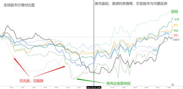 美股昨日的拐点发生在美股开盘前,接近美债夜盘开盘时间。可能是受到韩国抛售美元的消息面刺激,美债利率瞬间下滑,引发全球股市反弹。涨势在美股开盘后进一步加速,并一直维持到今日早盘。