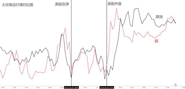 原油与铜:表现相近,在美股反弹时触底,在美股开盘后加速上涨。不过原油的涨势并没有在早盘延续。