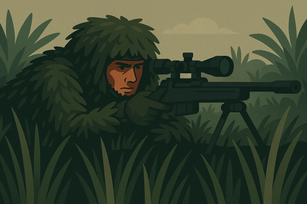 He waits for a verified target, confirmed by his tools, scope, and team.