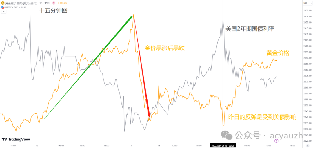 不过也就是在黄金抵达2400大关后,价格以更快的速度回吐了全部涨幅。而在伊朗袭击之后,周一的开盘金价并未出现波澜,直到美市开盘时段,美联储三把手的鸽派讲话让美债利率见顶回落,这才让金价触底反弹(负相关)。