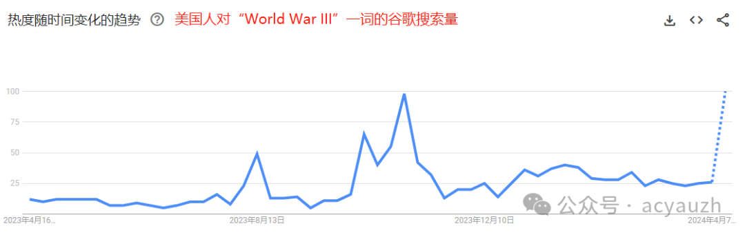 在过去一周内,美国人对“第三次世界大战”和“征兵年龄”等相关词汇的搜索量急速飙升,已经达到近五年来最高点。而前两次的顶点分别发生在俄乌和以巴刚刚开战的时候,可见伊朗的“大规模”袭击加剧了人们对全面战争的恐惧。年轻人纷纷担心美国也将被卷入战争的旋涡。也正是对世界大战的恐惧,支撑了近期金油表现,让黄金每盎司的价格上周四飙升了100美元。