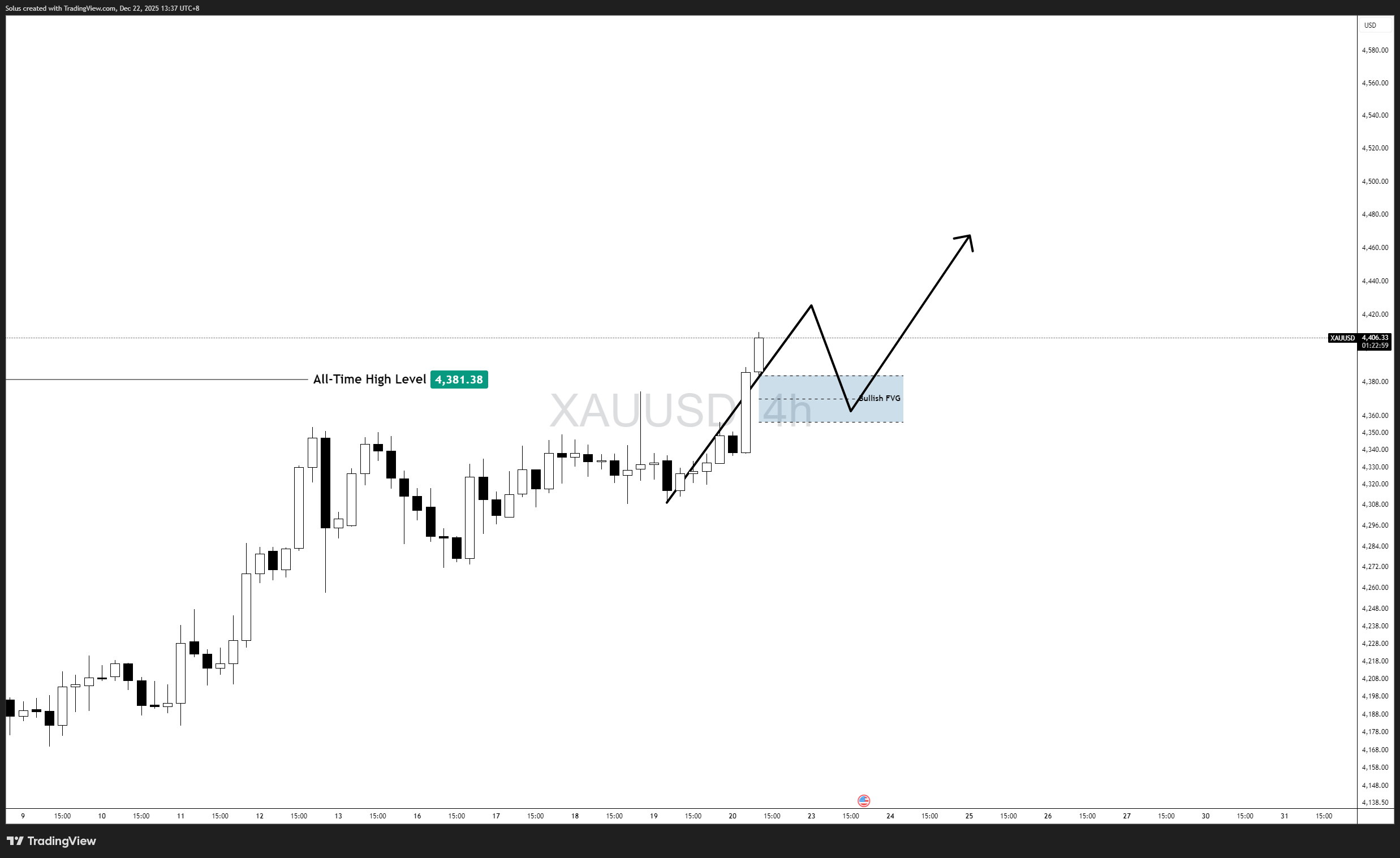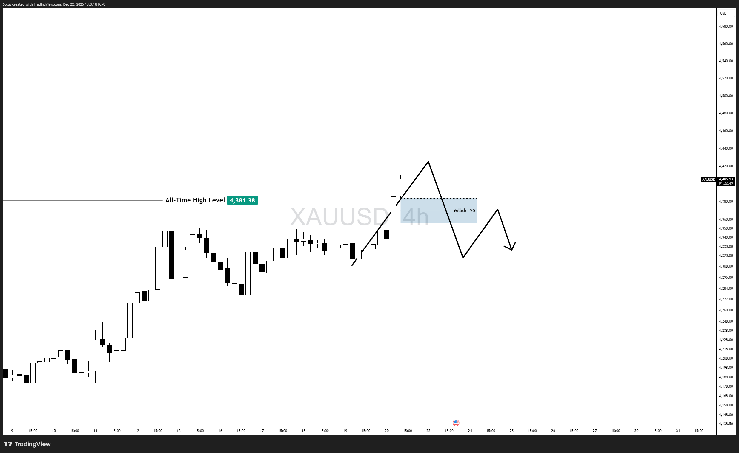 On the 4-hour chart, gold printed a strong impulsive leg above the all-time high, leaving behind a bullish Fair Value Gap (FVG). This FVG now acts as the key technical reference point for both bullish continuation and bearish correction scenarios.