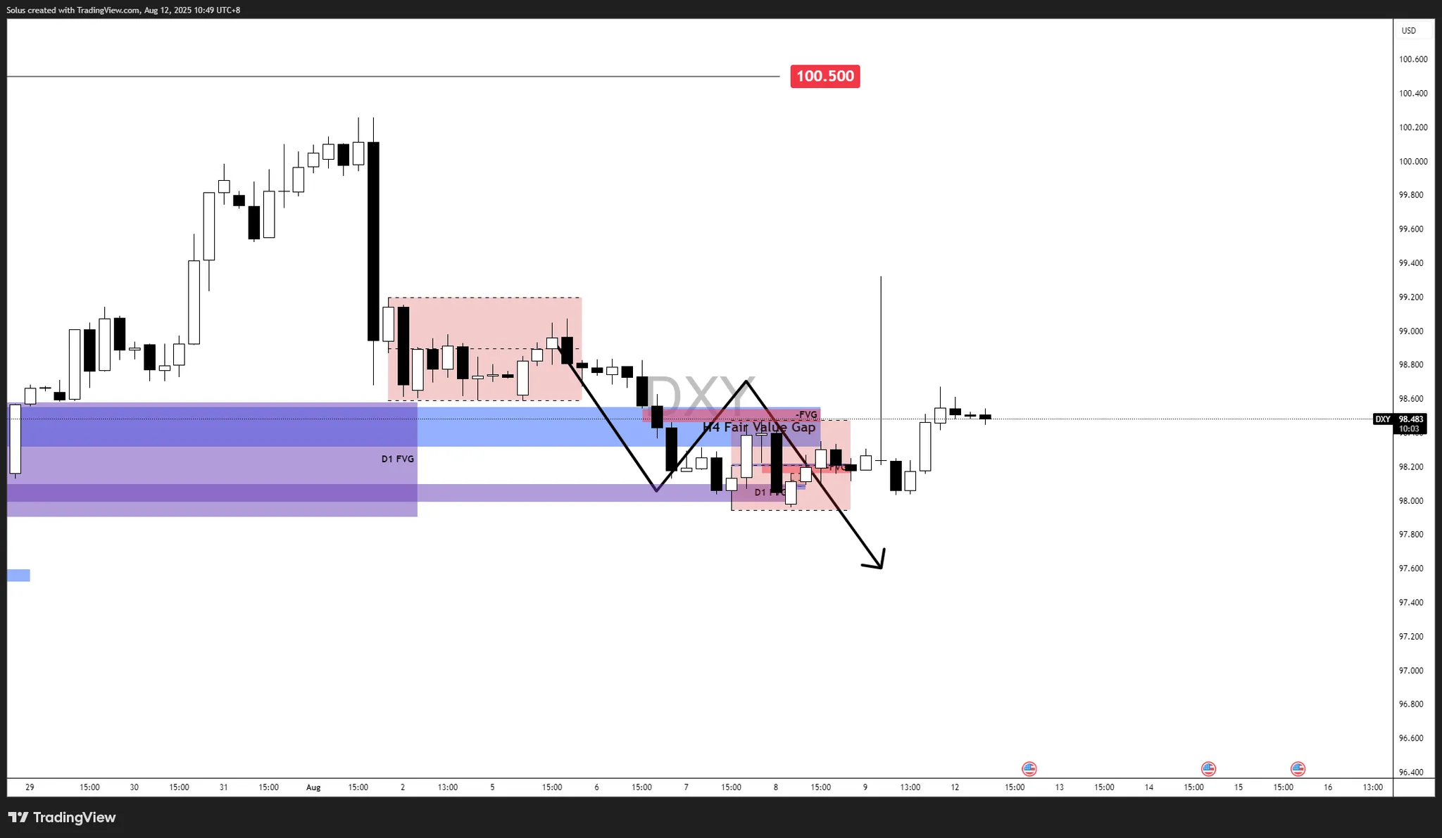 • Daily Fair Value Gap (D1 FVG): Acts as a key support zone around the 97.90 - 98.60 range.
