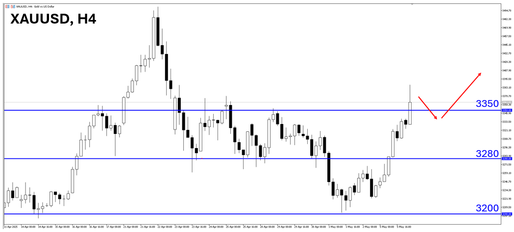 川普预计在5月7日公布半导体关税细节、和日本谈判并不如市场预期的顺利、且中美之间缺乏实质谈判(仅口头喊话),因此资金又重新回归黄金避险,加上美股标普500指数正在年线重要阻力寻求突破,昨天终止九天连涨的气势,在贸易协议尚未达成以前,恐怕标普指数还会在5550~5700震荡,美元也预计在100大关徘徊,直到美国与第一个国家达成贸易协议,否则市场将继续维持观望震荡的态度。