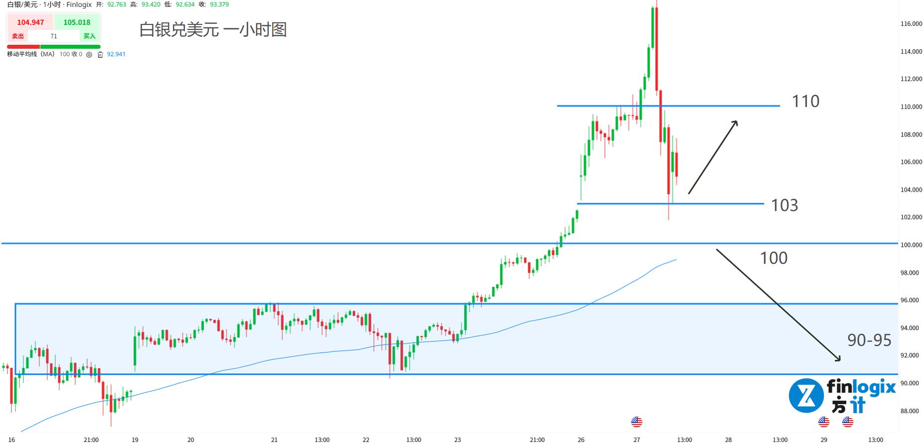 支撑参考:103;100(突破);90-95(跌破进一步做空)