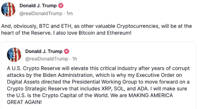 特朗普于社交平台中宣布将五种数位资产纳入加密战略储备