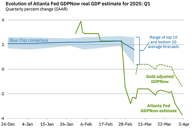 由于近期软数据与硬数据的表现不同步,例如消费者信心异常疲软,但新屋开工或者是工业产出却又表现的相对稳健,这让市场与投资者感到困惑。而美国亚特兰大联储所开发的即时预估GDP模型更是预估美国一季度的GDP会来到-3.7%,就算是近期调整黄金进出口过后的新模型,预估出来的GDP也同样是来到-1.4%。