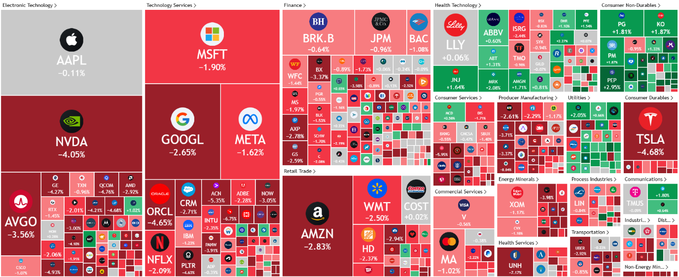 表现最差的是整个科技板块与先进制造业,由英伟达与特斯拉领跌。美国三大指数美盘期间集体持续下跌,纳指表现最差。不过有意思的是,医疗、必消与公共事业等防御型板块却逆向大涨。属于非常典型的“衰退周期”行情。前瞻性经济数据的急转向狠狠打了特朗普的脸。