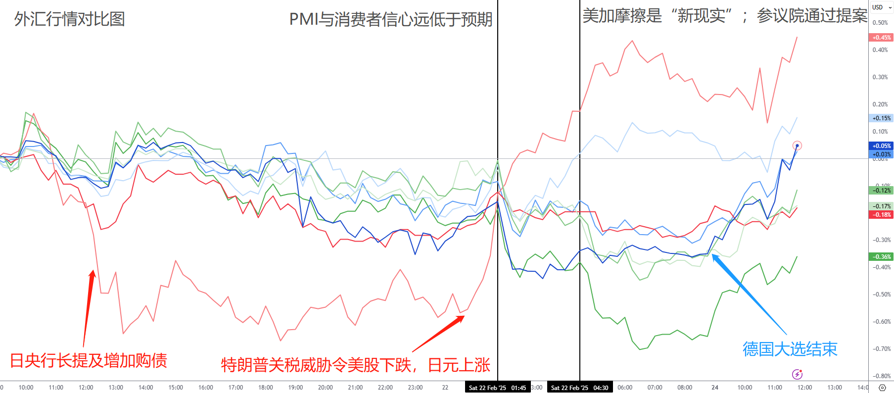 特朗普的关税威胁让美国人自己也开始担心起未来经济了,前瞻性经济数据暴跌,引发美股全面崩盘,连带全球股市与大宗商品齐跌。与此同时,避险货币瑞郎与日元上涨。德国大选后,欧元也持续反弹。